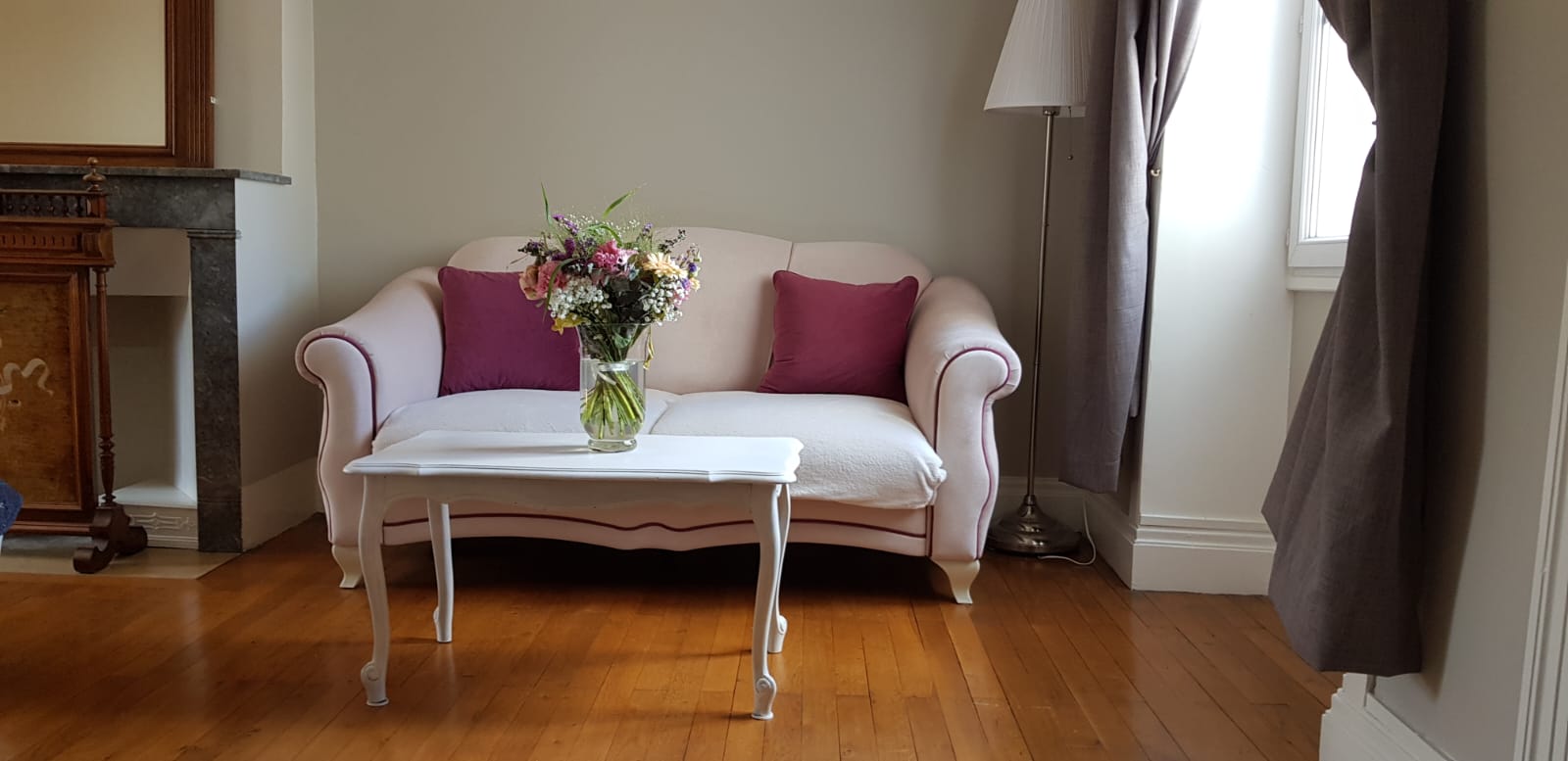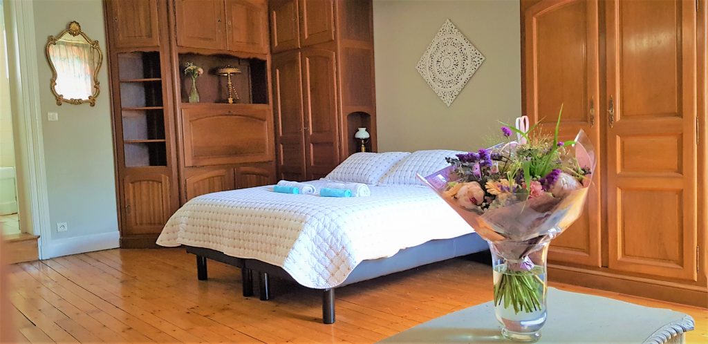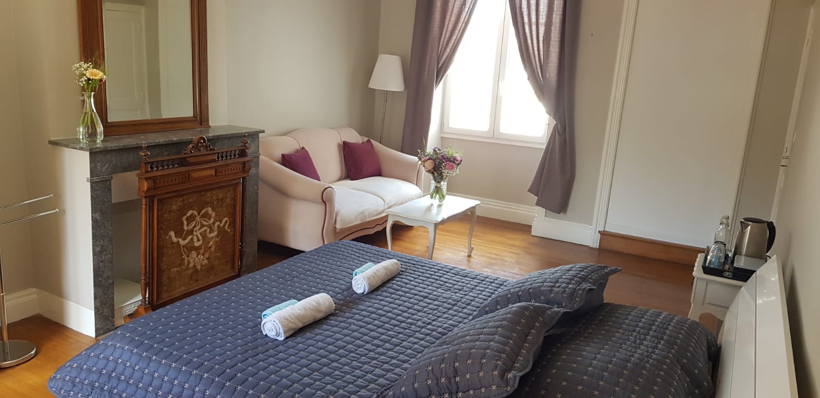 Grande chambre de 30 m² avec beaucoup de cachet, belle cheminée d'époque, literie double en 160 cm d'excellente qualité, un salon cosy et chaleureux.